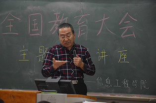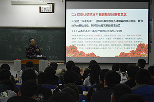 在讲座中,他传达了全国教育大会精神,简要讲解了全国教育大会提出的“九个坚持”,并在对比中外发展现状、尤其是梳理中国改革开放四十年取得的成就的基础上,阐述了“四个自信”对于我国教育发展事业的支撑。另外他重点阐述了抓本科教育的重大意义。他表示,身为新时代的青年人,一定要理解习近平总书记在全国教育大会上的讲话立意之高远、思想之深邃,这是习近平新时代中国特色社会主义思想在教育领域的全面阐述。因此全体学生一定要认真学习领会,结合自身经历在实践中予以践行。