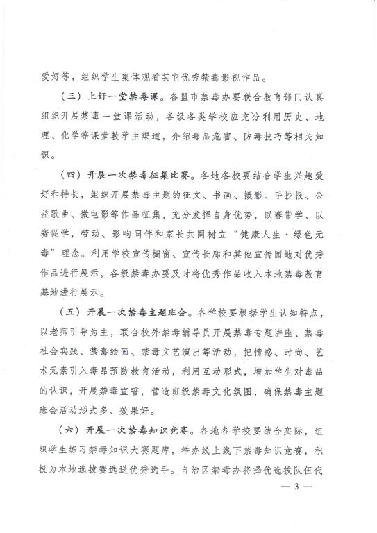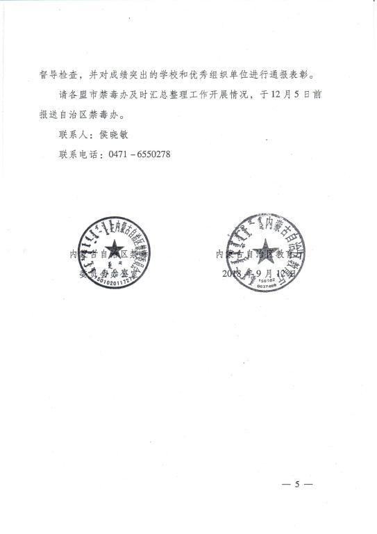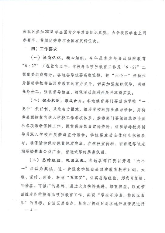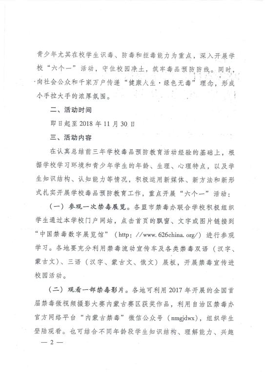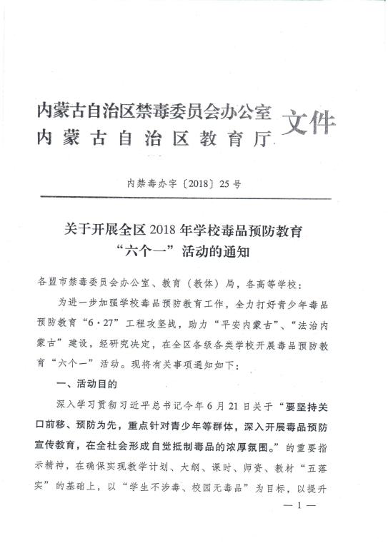 根据内蒙古自治区禁毒委员会办公室、内蒙古自治区教育厅联合下发的《开元(中国)开展全区2018年学校毒品预防教育“六个一”活动的通知》要求(以下简称《通知》),在全校开展毒品预防教育“六个一”活动。现将有关事宜通知如下。