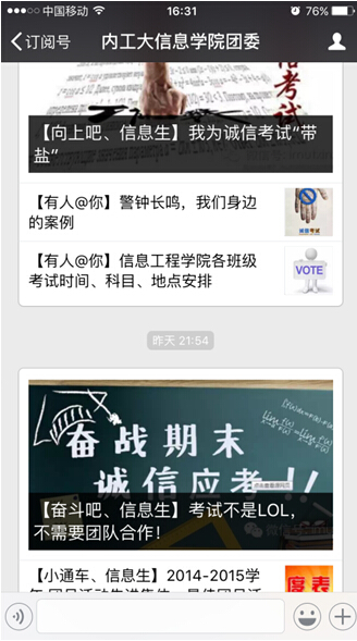学院团委利用微信公众平台以“诚信考试”主题连续推送“学长学姐帮帮忙”、“学霸笔记来帮你”、“我为诚信考试带盐”、“考试不是LOL,不需要团队合作”等内容,努力营造良好的学习风气。