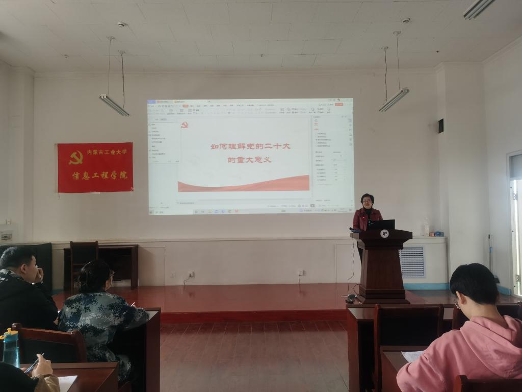 党委书记乌迪结合百年党史,追忆开国历程,鼓励同学们用青春之我创造青春之中国,不负伟大新时代,做新时代好青年;副研究员王彩玲就党的二十大的重要意义与同学们深入开展研讨交流,共同学习党和国家的历史性变革;副书记、副院长佟姝婕从不同的视角为同学们讲解了中国共产党为什么能;学院党委委员许霞结合党章内容,指导同学们如何成为一名合格的大学生党员;校外辅导员翟鹤引导同学们提高思想站位,重视大学生保密知识的学习。