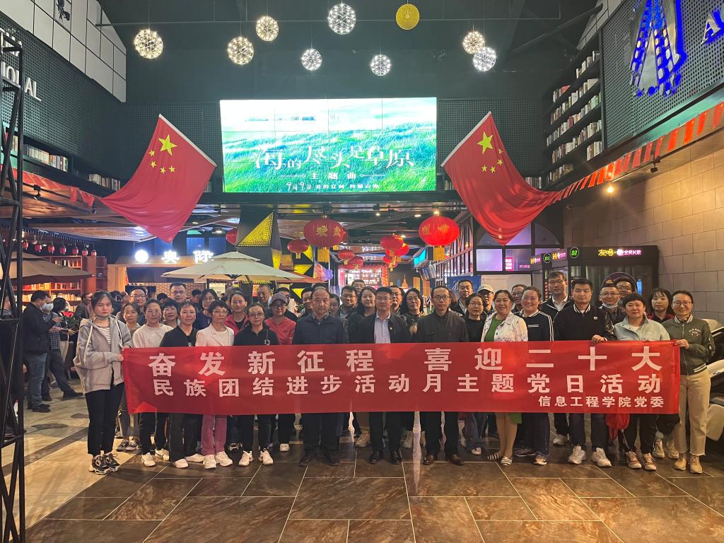 为践行守望相助理念,深化铸牢中华民族共同体意识教育,信息工程学院党委于9月23日下午开展“奋发新征程喜迎二十大”主题党日活动,组织教工党员60余人观看了影片《海的尽头是草原》。