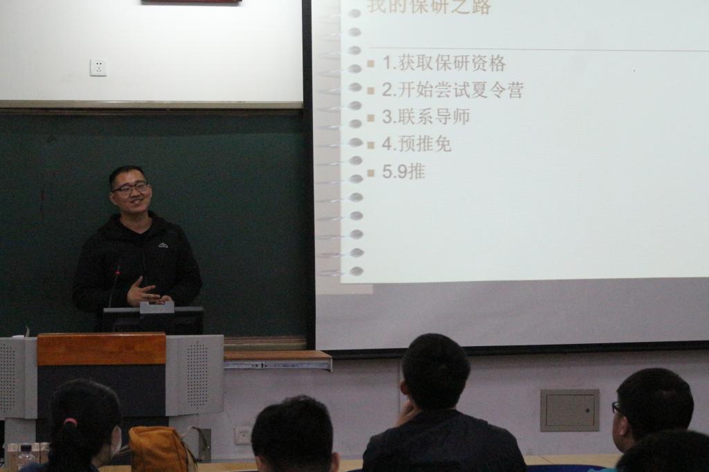 物联网15级王悦同学经过四年发奋努力,最终被保研到浙江大学。他讲述了自己大学阶段努力学习的过程,分享了自己保研之路的艰辛。他告诉师弟师妹们,很多高校都举办推免生夏令营活动,这是很好展示自己的机会。另外,一定要广泛的投递简历,多方联系导师,总结经验教训,把握任何可能的机会。他特别强调了英语的重要性,还温馨提示师弟师妹们最好提前做一份全英文的简历。