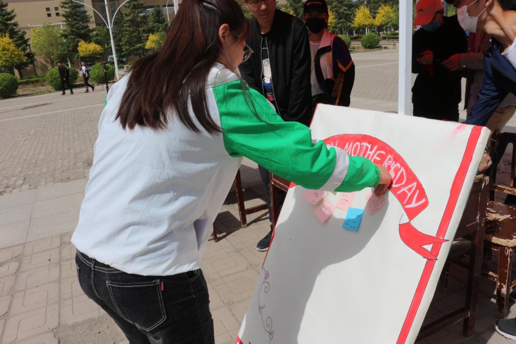 活动开始,同学们纷纷走到活动现场,用笔触写下对母亲的爱,他们写下话语,拍照留念,把他们的爱贴在活动板上。有些人还接受了志愿者们的采访,用音像对母亲遥寄祝福。