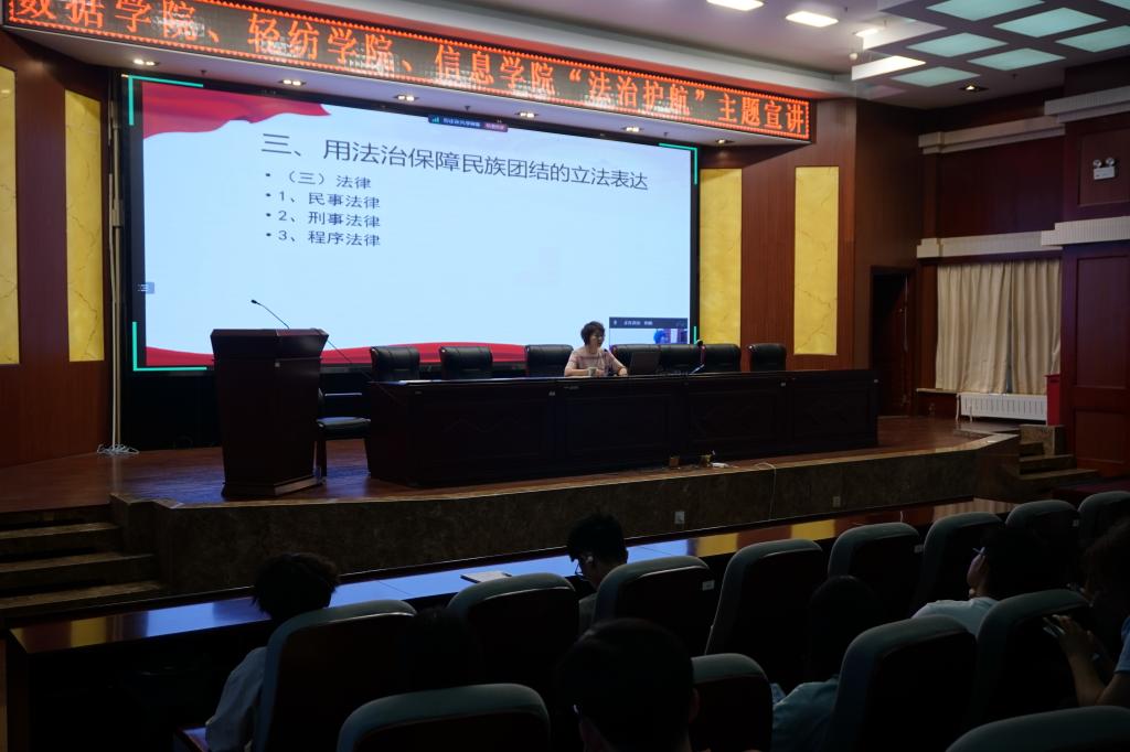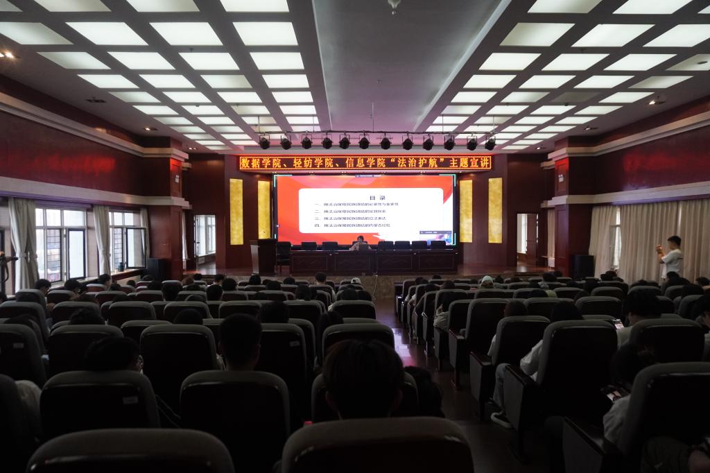 5月31日晚,信息工程学院、轻工与纺织学院与数据科学与应用学院联合组织教职工、学生在电力大楼十楼报告厅开展“法治护航”主题宣讲活动。本次活动邀请人文学院副院长张莉蔚做题为“用法治保障民族团结,推进民族团结进步事业高质量发展”的主题宣讲,160余名师生参加。