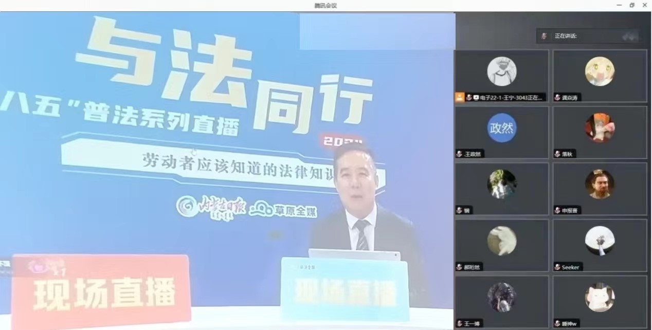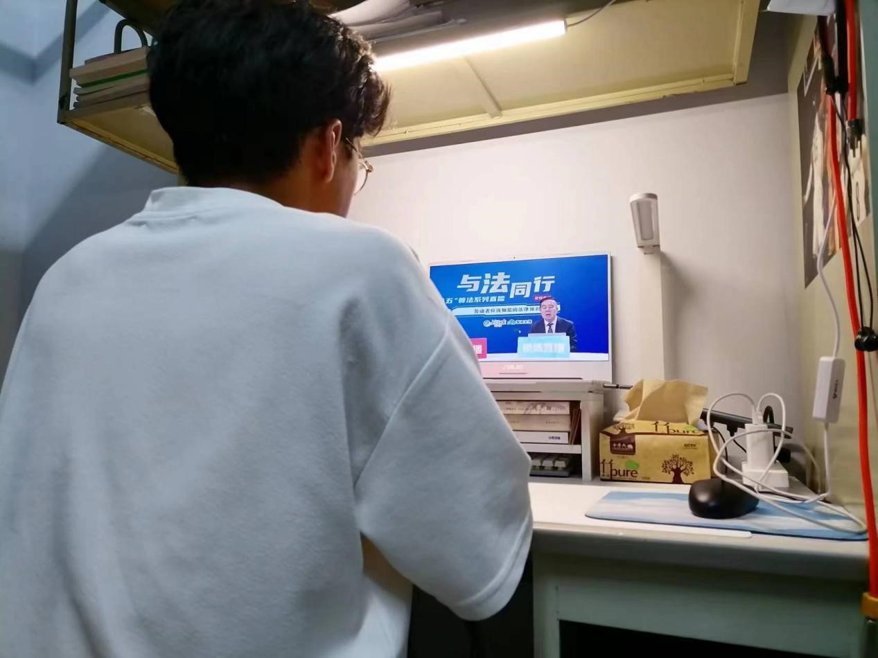 为推进全面依法治国,切实把习近平法治思想贯彻落实到全面依法治国全过程,落实普法责任,加强普法工作。4月29日晚,信息工程学院组织学生在北二“一站式”学生社区、宿舍及线上观看了主题为“与法同行——劳动权益保护法”的公益直播课。