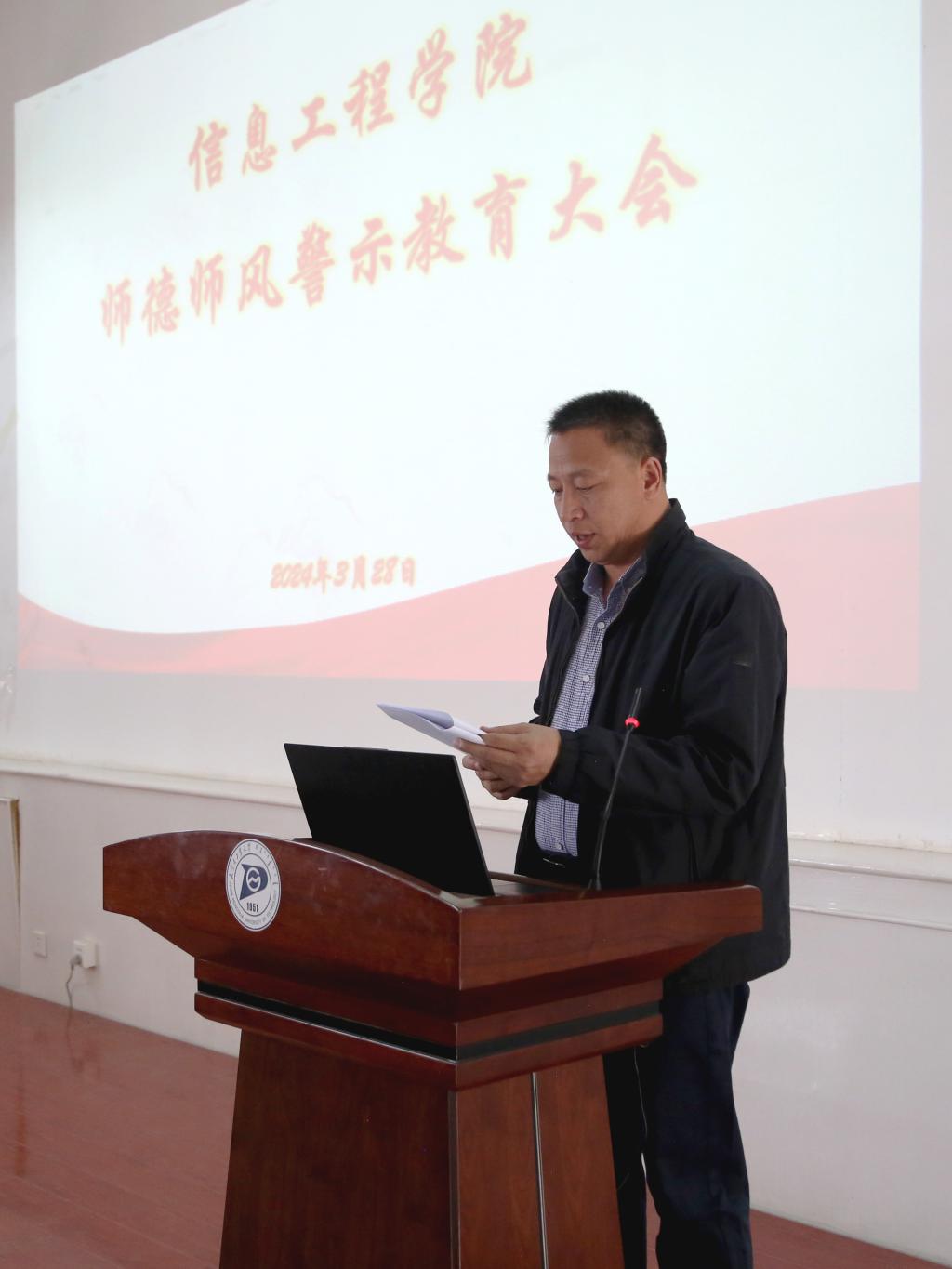 学院党委书记刘建国传达学校师德师风警示教育工作会议精神,通报2023年教育部公开曝光的违反教师职业行为十项准则典型案例和2023年我校处理的师德师风失范典型案例,强调全体教师应严格遵守新时代高校教师职业行为十项准则,坚持“自重、自省、自警、自律”,规范自身一言一行,营造讲师德、树师德的良好氛围。