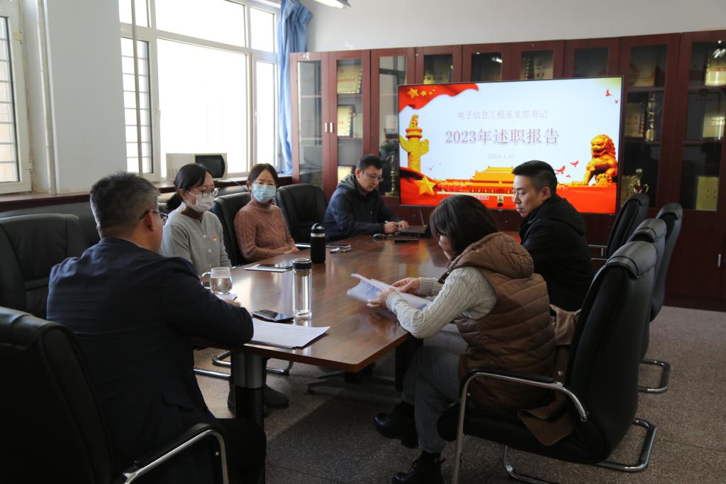 会议按照“一述一评”的方式进行,各教工党支部书记结合2023年抓基层党建工作,重点围绕深入学习贯彻习近平新时代中国特色社会主义思想,学习贯彻党的二十大精神情况;落实党的组织生活制度和基层党组织按期换届制度情况;完成学院年度重点工作任务,在重大任务中彰显基层党建工作成效情况;落实党建责任制情况;支部特色工作等方面进行述职汇报,实事求是地分析存在的不足,明确下一步工作思路与改进举措。