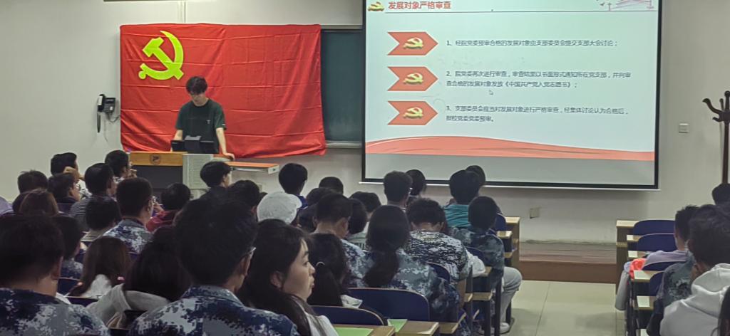 本次活动由通信专业学生党支部朱致慧、电子专业学生党支部王琦、计算机专业学生党支部章新悦共同主持。三位主讲人向同学们介绍了中国共产党百年辉煌历程,并从入党动机、争取入党的基本条件及程序等方面进行了详细的讲解。