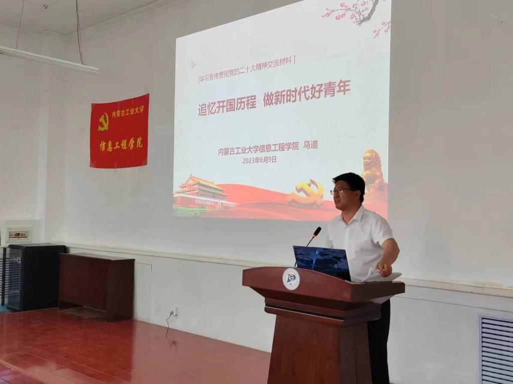 6月9日,信息工程学院党委书记乌迪以“追忆开国历程 做新时代好青年”为题,面向全院学生入党积极分子讲授主题教育专题党课。