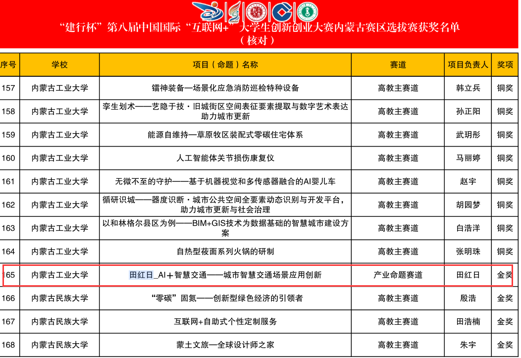2022年度,学院积极响应国家“大众创业、万众创新”的号召,积极组织学生参与学科竞赛,在师生的共同努力下,收获颇丰。截至目前,共计获奖228项,其中,国家级奖项53项、省部级奖162项。其中,我院庄旭菲老师指导,田红日、陈金星、张宁宇、孟丹丹等人完成的《AI+智慧交通——城市智慧交通场景应用创新》项目代表学校参加第八届中国“互联网+”大学生创新创业大赛获得自治区级金奖、国家级铜奖的优异成绩。