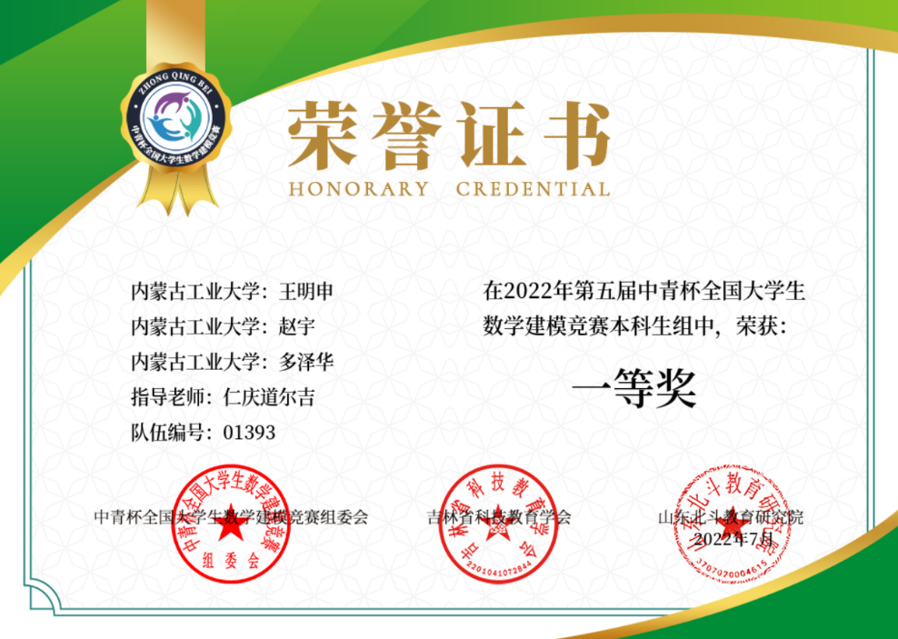 我院学生王明申、赵宇、多泽华3名同学所在小组通过查阅统计年鉴等相关数据并结合我国当前国情,建立 Leslie 矩阵人口模型以及多种评价模型并结合机器学习分类算法,完成了对三孩政策下的各影响因素的分析与讨论,以及对未来人口情况的预测和未来相关政策的建议。代表学校取得国家级一等奖的好成绩,并获得了特等奖提名及答辩资格。